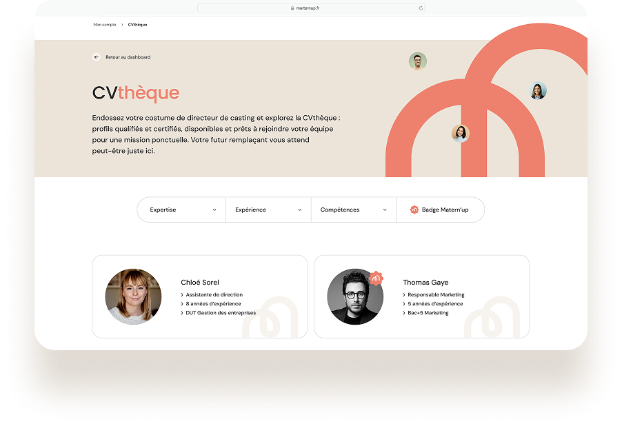 C’est là qu’est née l’idée de Matern’Up : une plateforme spécialisée et dédiée aux remplacements de congés maternité et parentaux.